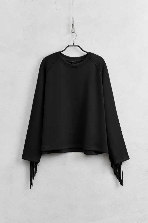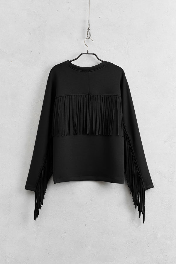 Felpa over con collo rotondo.Dettaglio frange nella parte posteriore.Vestibilità morbida, disponibile in taglia UNICA